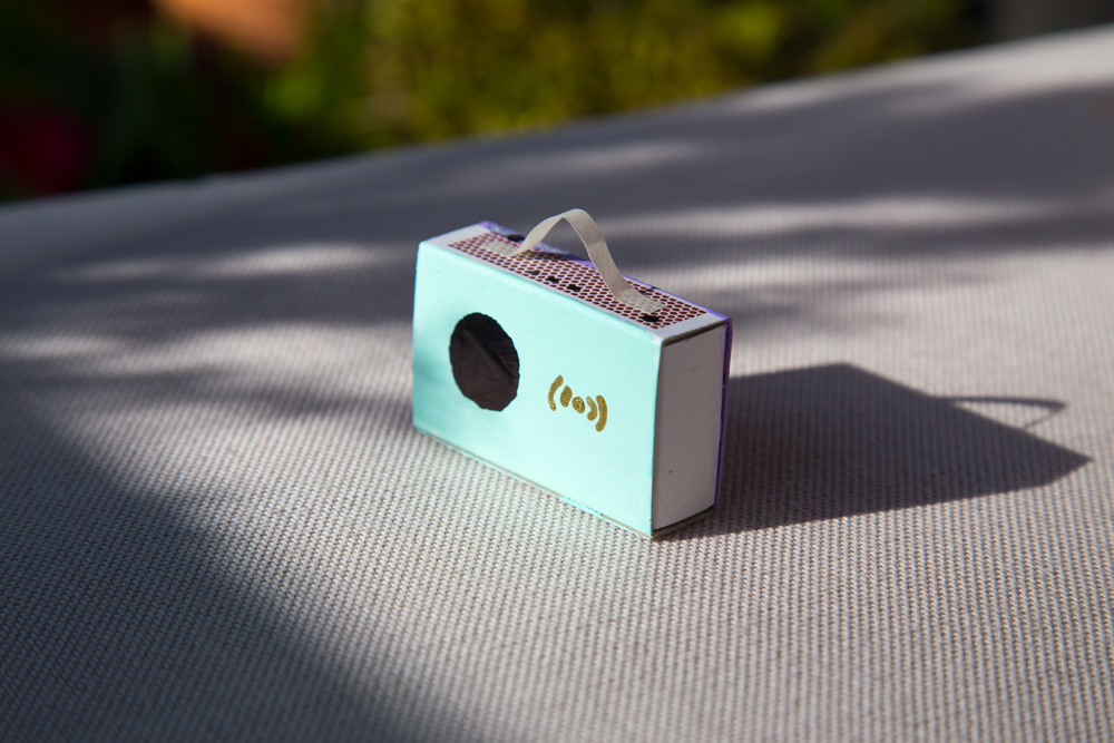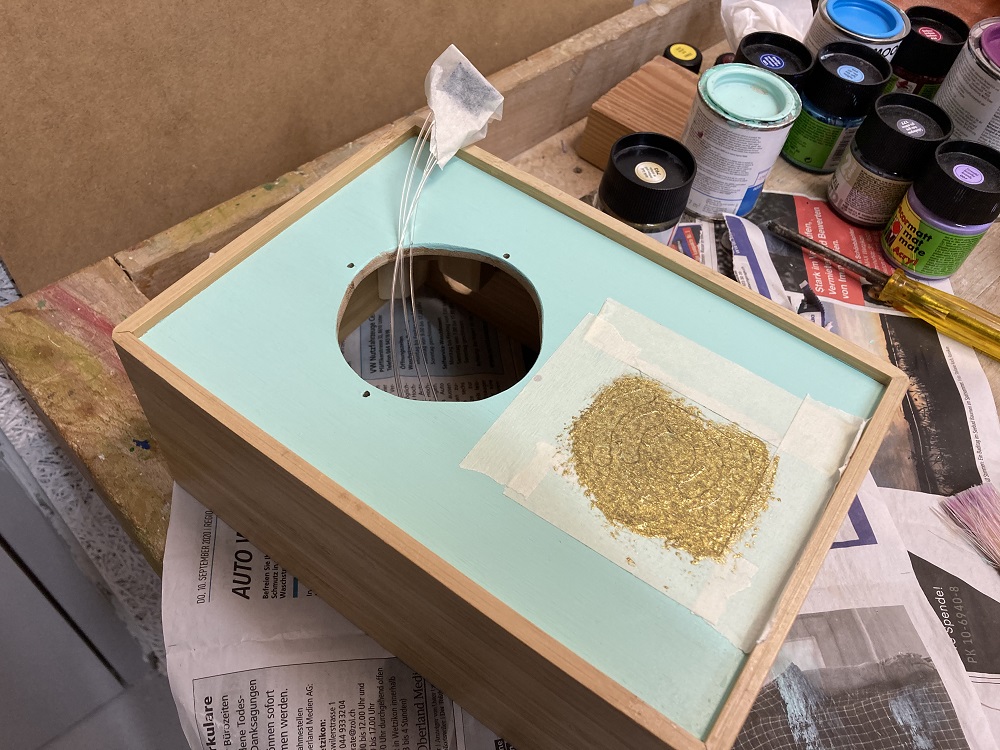Nun war meine Phoniebox bereit für den Anstrich. Für das RFID-Zeichen und die Pause-, Zurück- und Vor-Taste, habe ich Schablonen aus Malerband gefertigt und die Farbe entsprechend aufgetragen.