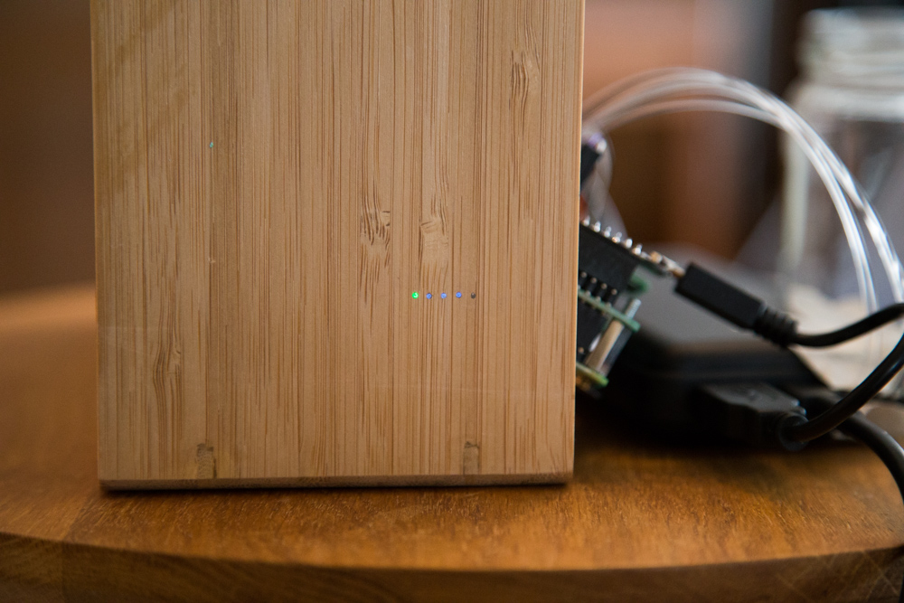 Auf der einen Seite habe ich dann mit dem Handbohrer noch 1mm dicke Löcher für die Glasfasern gebohrt, damit die LEDs der Powerbank auch von ausserhalb sichtbar sind. Da ich die Powerbank nicht gleich fix mit den Glasfasern verleimen wollte, habe ich einen Adapter aus Fimo geformt und angeklebt. Das Prinzip hat sich leider aber nicht so bewährt, da der Adapter sehr schnell wieder abfällt.