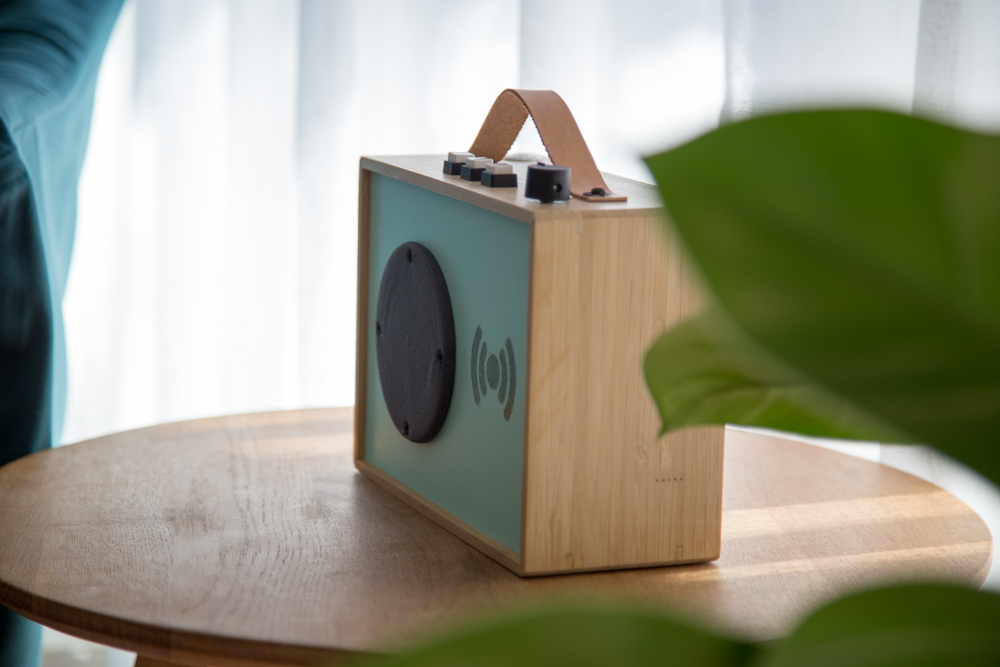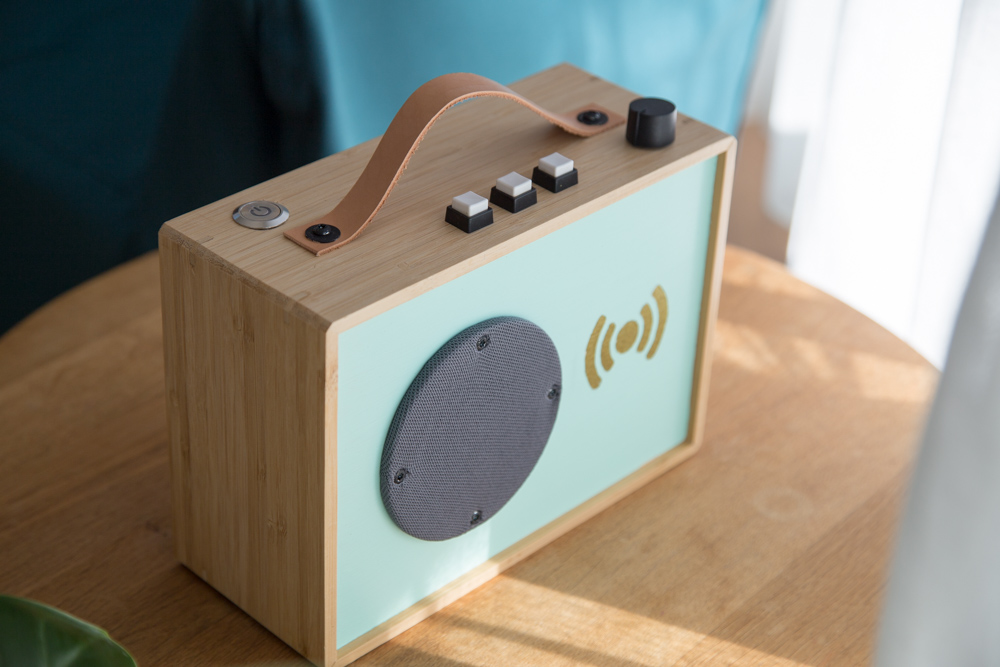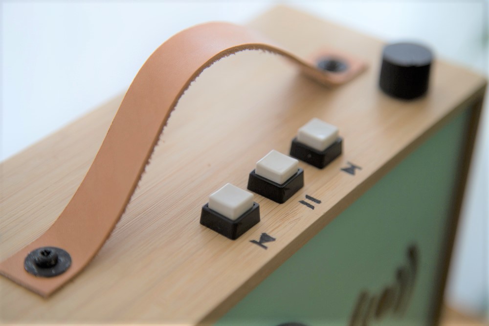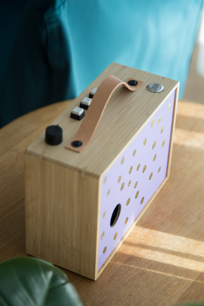 Nun fehlte nur noch das Lederband als Griff und der Lautsprecherstoff zum Schutz der Lautsprechermembran. Zur Verbesserung der Klangqualität, habe ich dann später auf die abnehmbare Rückwand noch einen Dämmschaumstoff aufgeklebt.