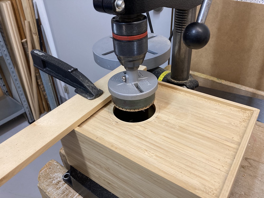 Nachdem klar war, was wohin kommt, waren die grossen Löcher dran. Leider hatte ich für den Lautsprecher kein genug grossen Bohrer, was mich dann einiges an Zeit gekostet hatte, ein einigermassen rundes Loch dafür hinzukriegen. Zum Glück konnte ich diese Unschönheit elegant hinter dem Rand des Lautsprechers verbergen.